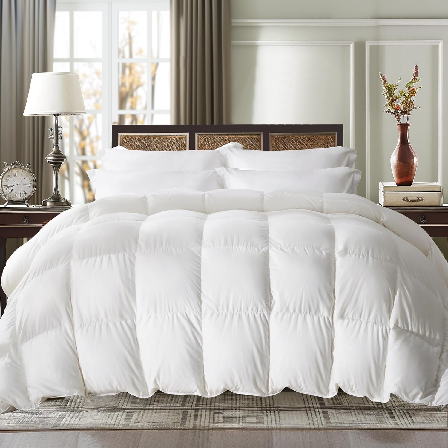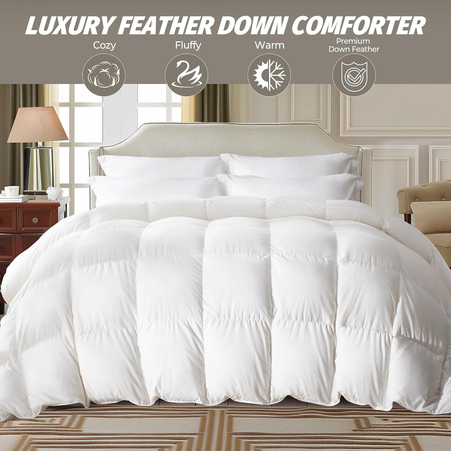 • 【Unique Design】- Our feather comforter full/queen size (90*90”) features double-needle stitching and piping to enhance its durability. This keeps the top and bottom shells together better and prevents the seams from opening up and the filling leaking out.