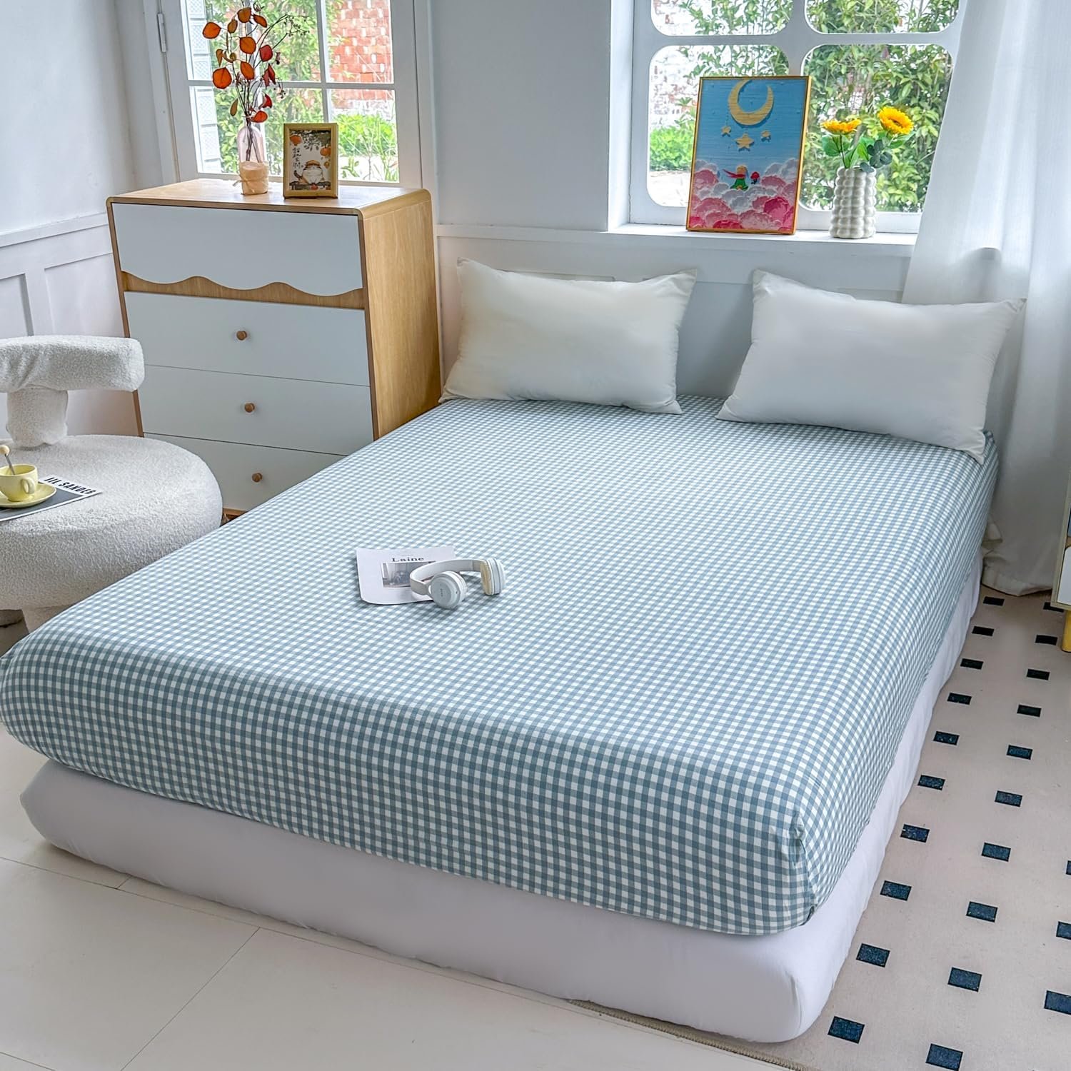 Light blue checkered fitted sheet (Queen size only), 16-inch deep pockets, 100% washed cotton white checkered base sheet, soft, breathable, and easy to care for