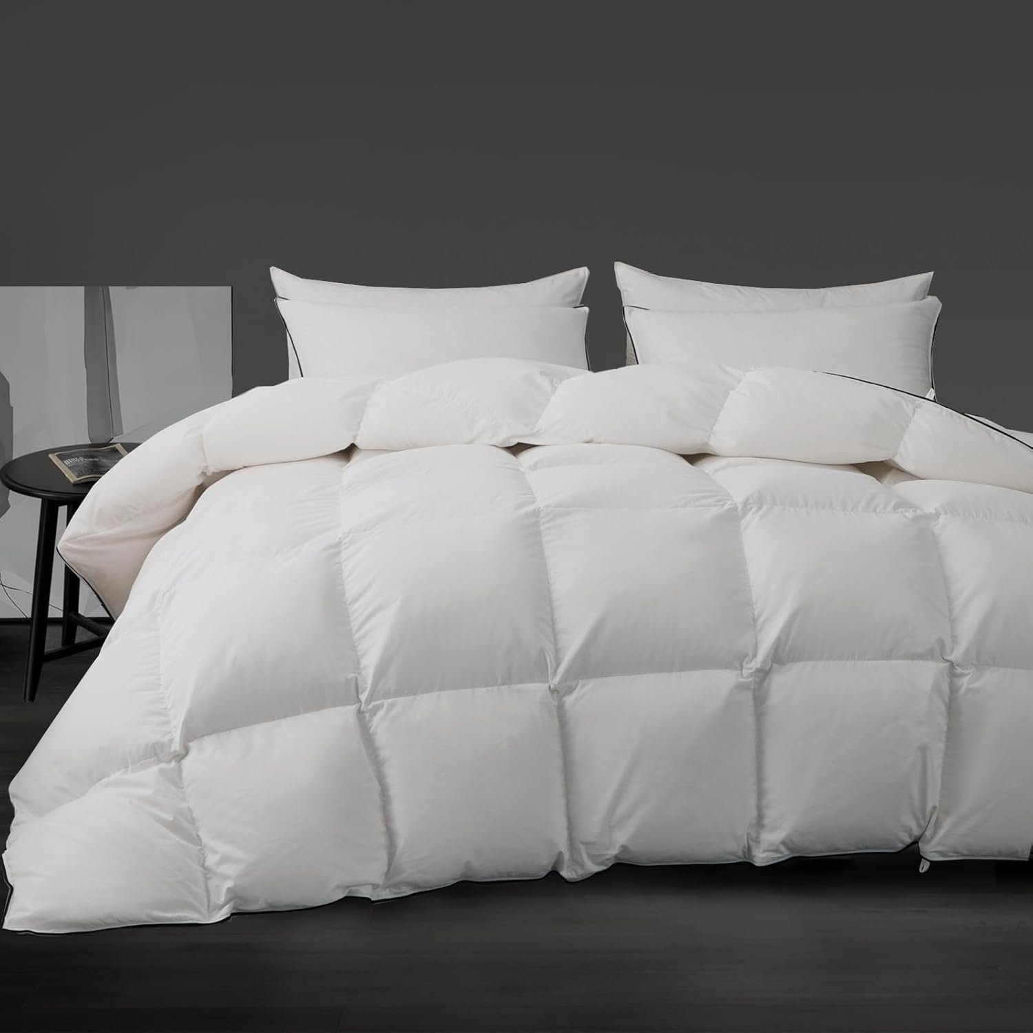 - 【ELEGANT AND COMFORTABLE APPEARANCE】Our white down comforter covers are made with 430 count cotton poly blend duvet cover shells(58% Cotton 42% Polyester), which are soft to the skin, breathable and static-free to improve your sleep quality. The edges of the duvet cover have a black piping design with double stitching to lock in the down while adding a luxurious feel. It’s like a five-star luxury hotel collection.